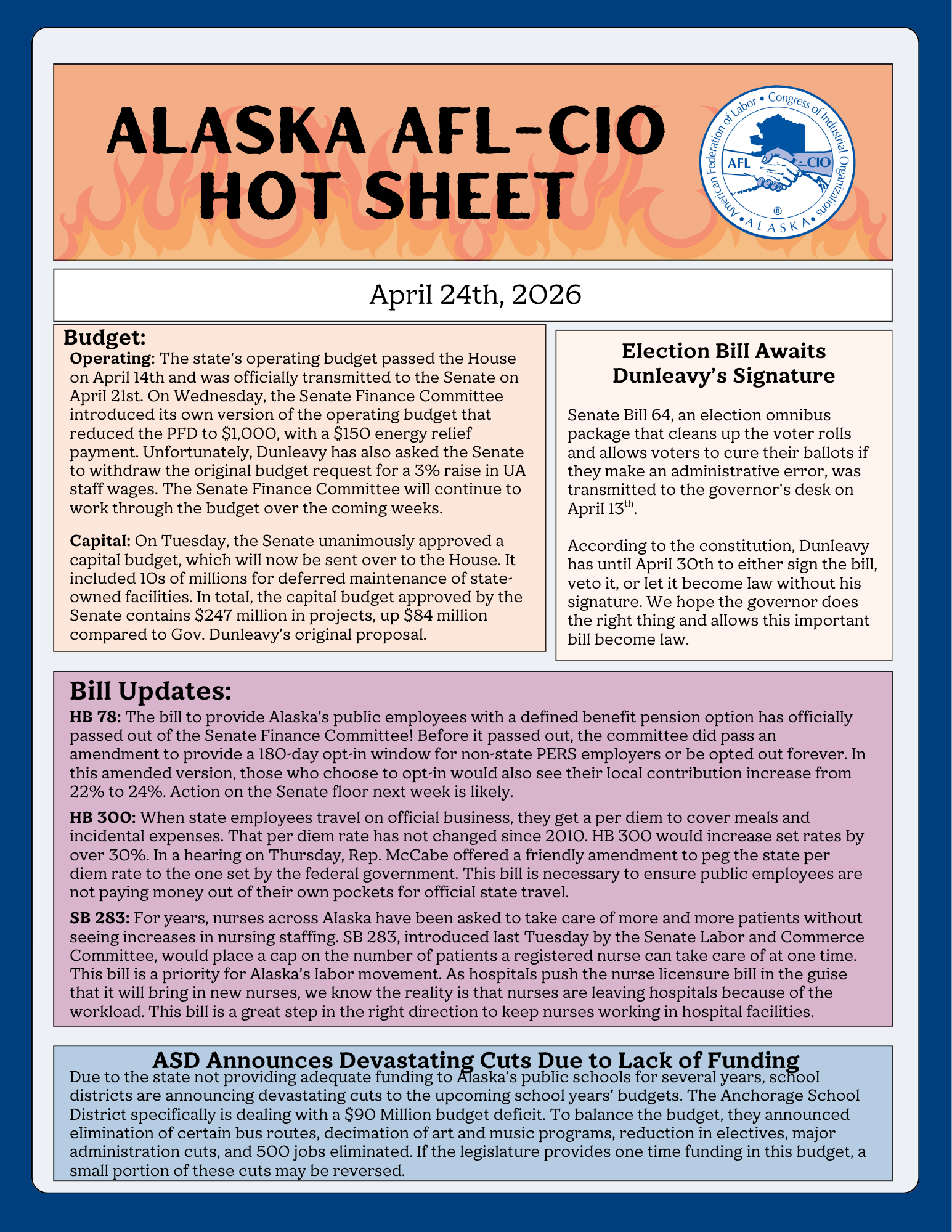 The Hot Sheet is your one-stop shop for tracking legislative issues important to Alaska’s Labor Movement. This 1-pager is updated weekly, tracks essential legislation, and provides opportunities to make your voice heard.