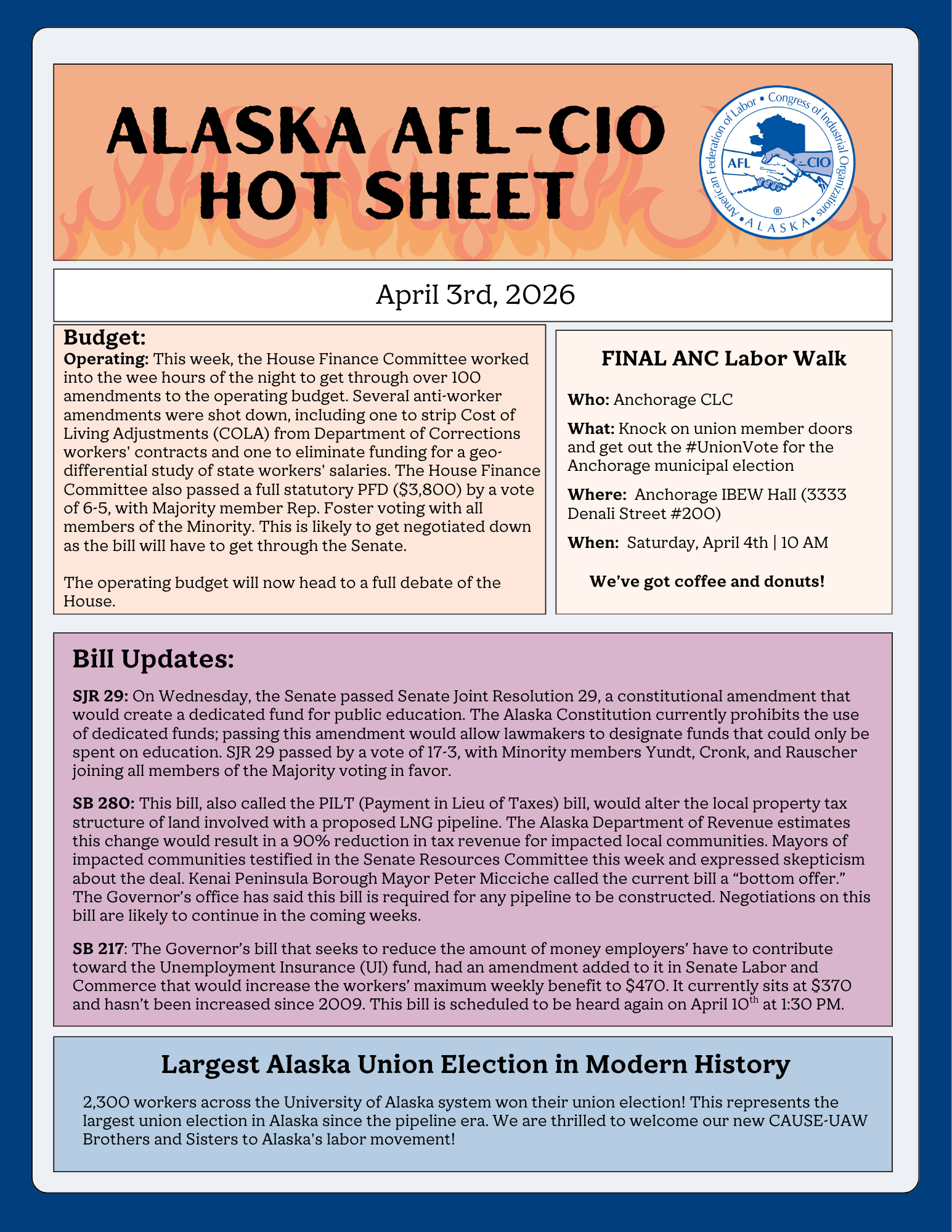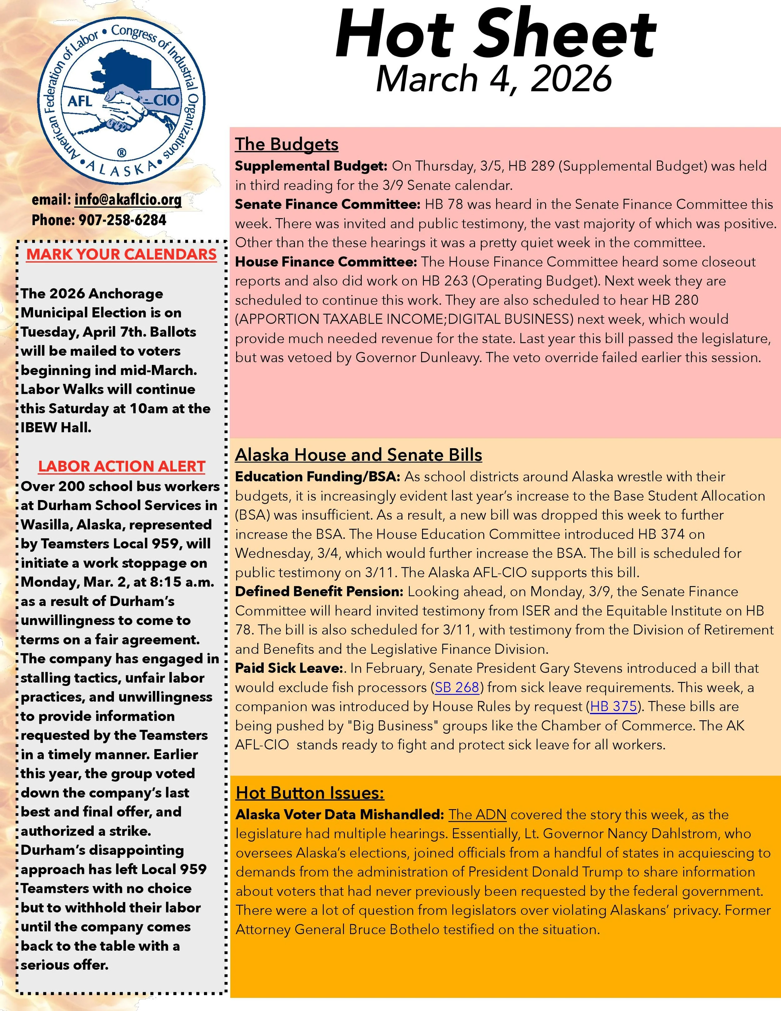 The Hot Sheet is your one-stop shop for tracking legislative issues important to Alaska’s Labor Movement. This 1-pager is updated weekly, tracks essential legislation, and provides opportunities to make your voice heard.